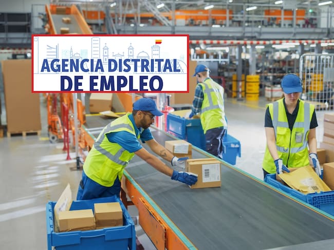 De fondo: Operadores logísticos trabajando. Arriba a la izquierda, el logo de la Agencia Distrital de Empleo de Bogotá (Crédito: Getty Images & Alcaldía de Bogotá)