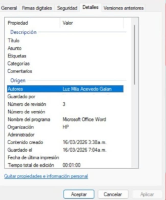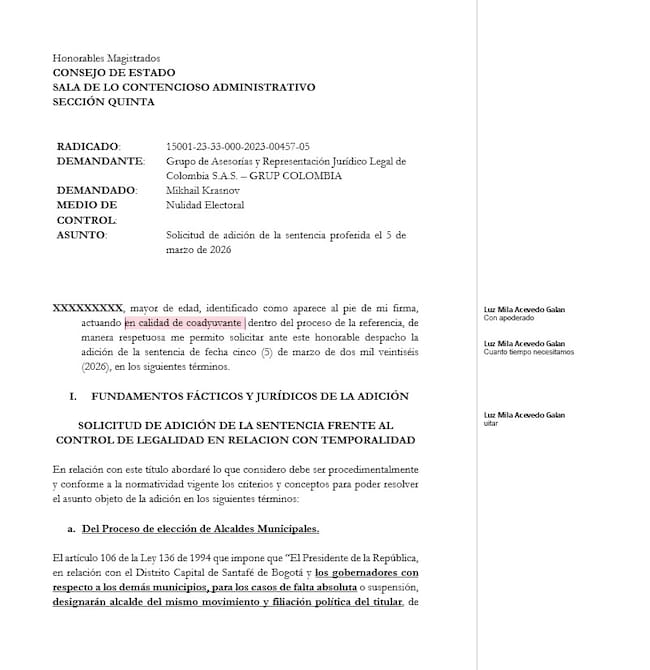 El documento que supuestamente fue presentado el 13 de marzo por Joseph Esteban Montenegro Galindo quien funge como coadyuvante del demandado alcalde de Tunja, no terminó de ser diligenciado y haciendo trazabilidad se puede ver que fue elaborado por Luz Mila Acevedo Galán, actual secretaria de Contratación de Tunja.