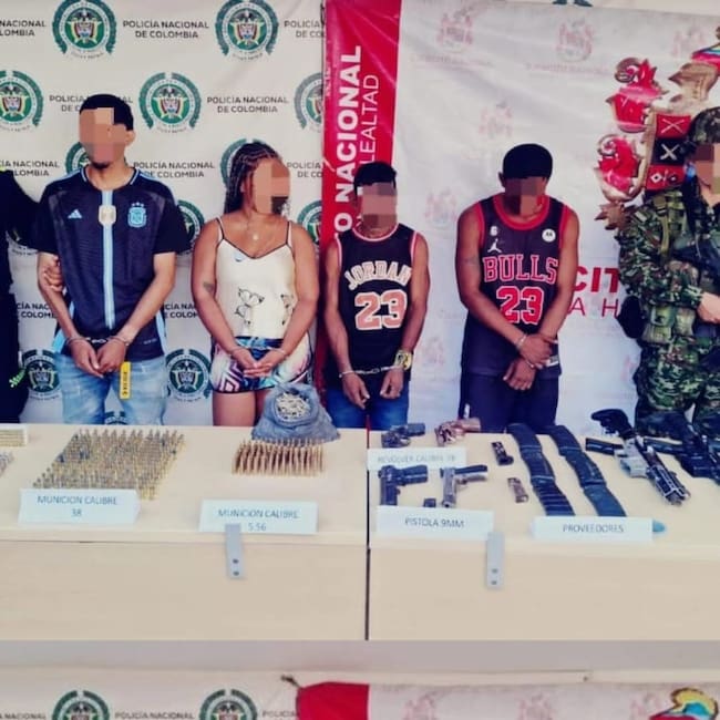 Durante el procedimiento se incautó material de guerra, entre el que se encuentran 4 fusiles, 4 armas cortas, proveedores y munición de diferentes calibres, elementos que presuntamente eran utilizados para intimidar a la población civil y ejecutar actividades ilícitas.
