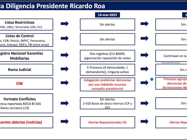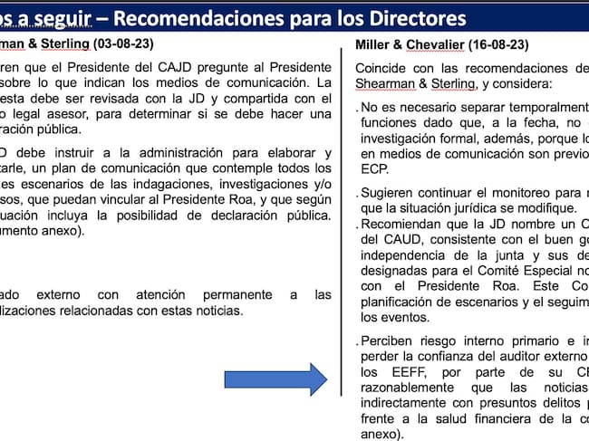 Desde agosto de 2023 se viene advirtiendo a la junta directiva de Ecopetrol sobre los riesgos de tener en la presidencia de la compañía a Ricardo Roa. Un análisis rutinario de la Vicepresidencia Corporativa de Cumplimiento de agosto de 2023, titulado “Debida Diligencia y Recomendaciones Presidente Roa”, incluyó un breve análisis de las firmas internacionales Miller & Chevalier y Shearman & Sterling. Ambas coincidieron en que no era necesario separarlo temporalmente del cargo, ya que en ese momento no existía ninguna investigación formal en su contra y los hechos mencionados en medios eran anteriores a su llegada a la compañía. Sin embargo, recomendaron mantener un monitoreo permanente de la situación jurídica y que la junta directiva creara un comité especial dentro del Comité de Auditoría para evaluar escenarios y hacer seguimiento al caso.
