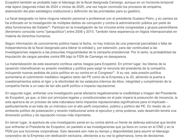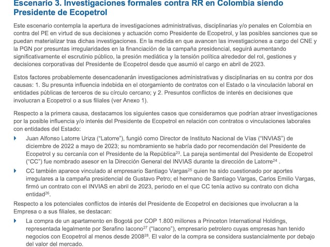 En el tercer escenario, el documento contempla que se abran investigaciones formales contra Roa mientras ejerce como presidente de Ecopetrol, lo que elevaría aún más los riesgos para la compañía. En particular, advierte sobre el impacto que esto podría tener en los mercados internacionales, dado que Ecopetrol cotiza en la Bolsa de Nueva York.