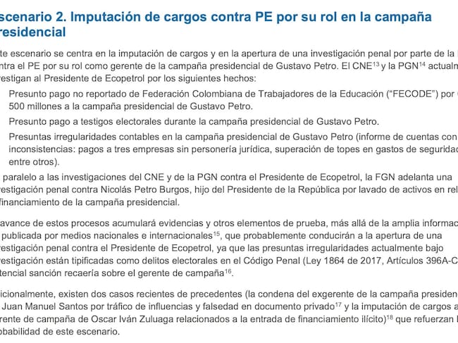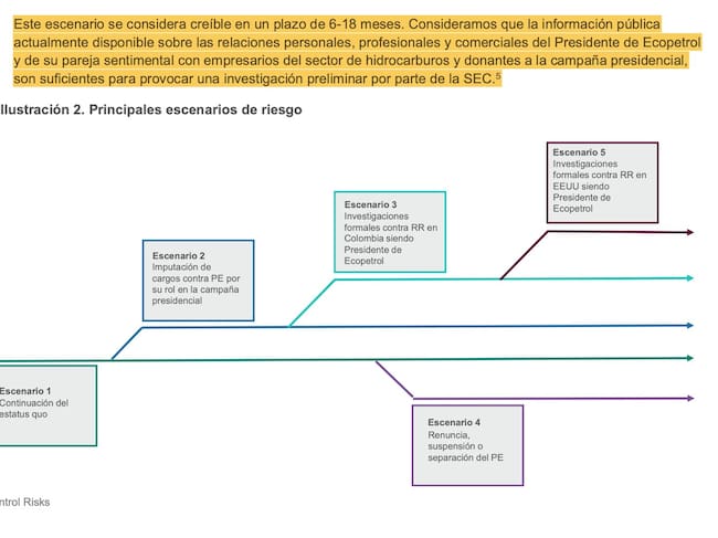 Además, menciona el aumento de filtraciones de información, presión política sobre la empresa y mayor incertidumbre entre inversionistas, reguladores y socios comerciales sobre la estabilidad y la independencia del gobierno corporativo de la compañía. Y luego, el escenario 5 habla de investigaciones formales contra Ricardo Roa en EE. UU. siendo presidente de Ecopetrol.