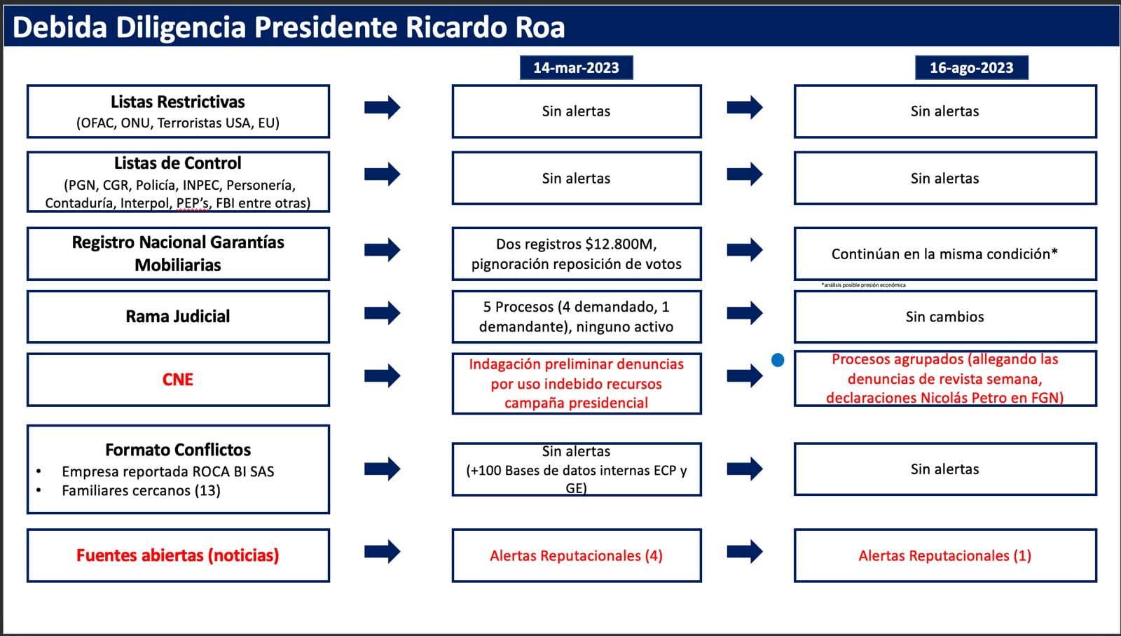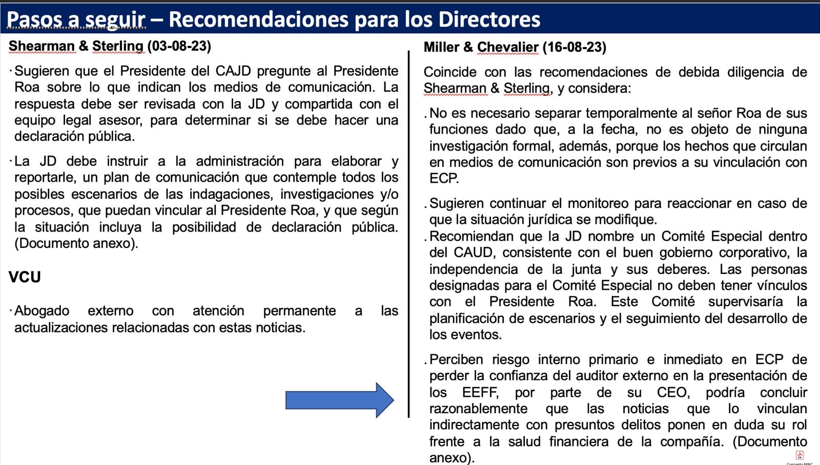 Desde agosto de 2023 se viene advirtiendo a la junta directiva de Ecopetrol sobre los riesgos de tener en la presidencia de la compañía a Ricardo Roa. Un análisis rutinario de la Vicepresidencia Corporativa de Cumplimiento de agosto de 2023, titulado “Debida Diligencia y Recomendaciones Presidente Roa”, incluyó un breve análisis de las firmas internacionales Miller & Chevalier y Shearman & Sterling. Ambas coincidieron en que no era necesario separarlo temporalmente del cargo, ya que en ese momento no existía ninguna investigación formal en su contra y los hechos mencionados en medios eran anteriores a su llegada a la compañía. Sin embargo, recomendaron mantener un monitoreo permanente de la situación jurídica y que la junta directiva creara un comité especial dentro del Comité de Auditoría para evaluar escenarios y hacer seguimiento al caso.