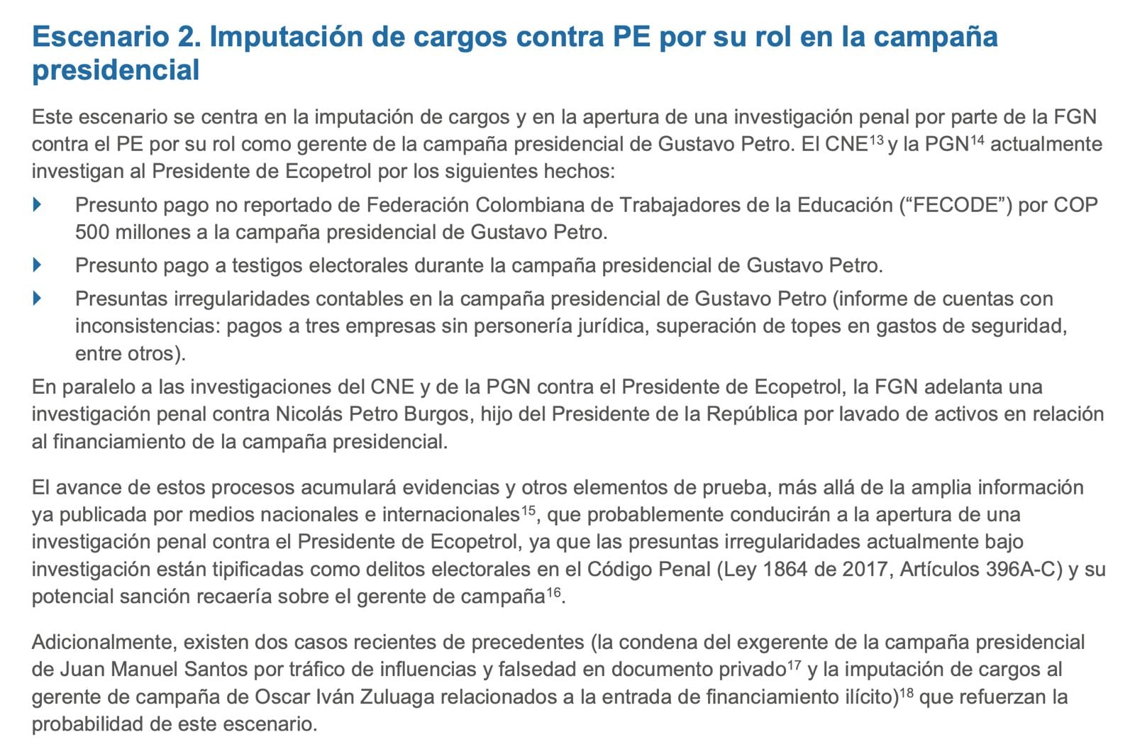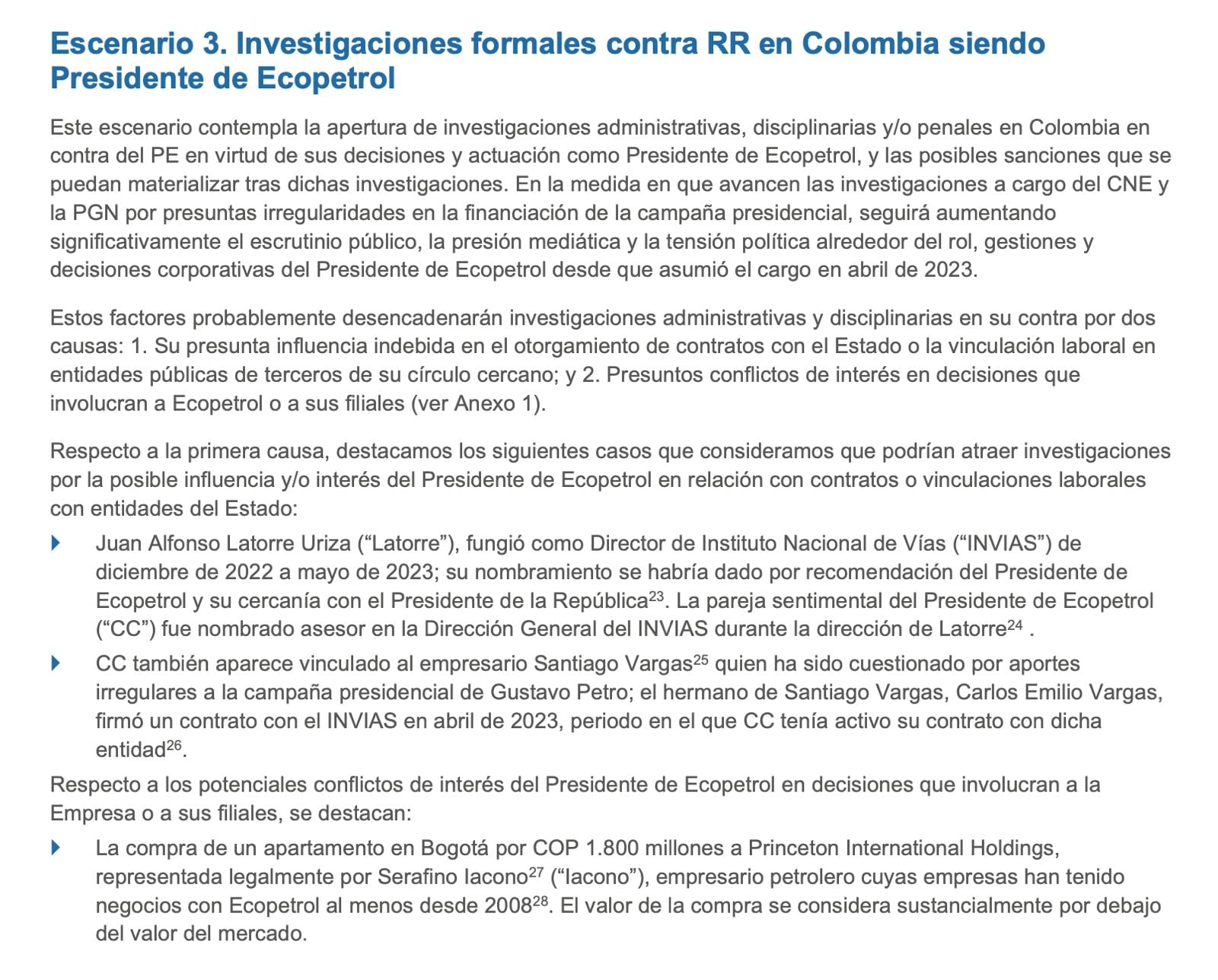 Este escenario se consideraba en ese momento, marzo de 2024, creíble en un plazo de 6 a 18 meses. Según el informe, la información pública disponible sobre las relaciones personales, profesionales y comerciales del presidente de Ecopetrol y de su pareja con empresarios del sector de hidrocarburos y donantes de la campaña presidencial podría ser suficiente para provocar una investigación preliminar de la SEC. Dos años después de la publicación, Roa ha sido imputado por el delito de tráfico de influencias relacionado con la compra del apartamento 901 en Bogotá, y los contratos posteriores que la petrolera le dio al comprador, el excoronel Juan Guillermo Mancera. Todavía le falta una imputación por su presunta responsabilidad en el delito de violación de topes electorales, que ocurrirá el próximo 8 de abril.