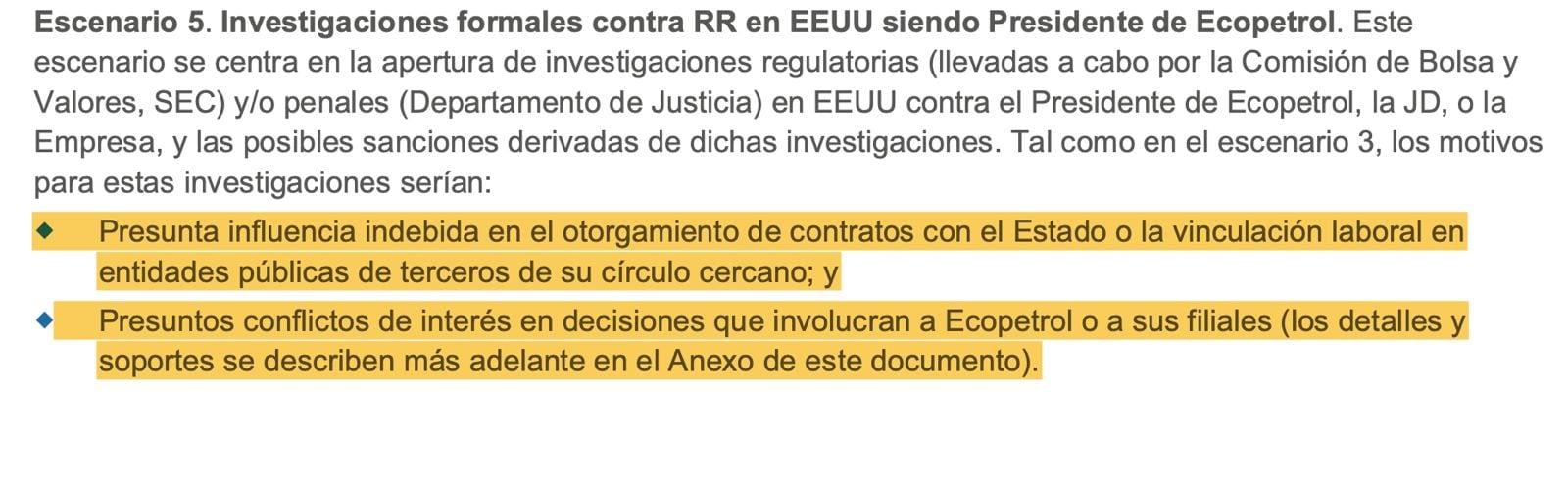 Además, menciona el aumento de filtraciones de información, presión política sobre la empresa y mayor incertidumbre entre inversionistas, reguladores y socios comerciales sobre la estabilidad y la independencia del gobierno corporativo de la compañía. Y luego, el escenario 5 habla de investigaciones formales contra Ricardo Roa en EE. UU. siendo presidente de Ecopetrol.