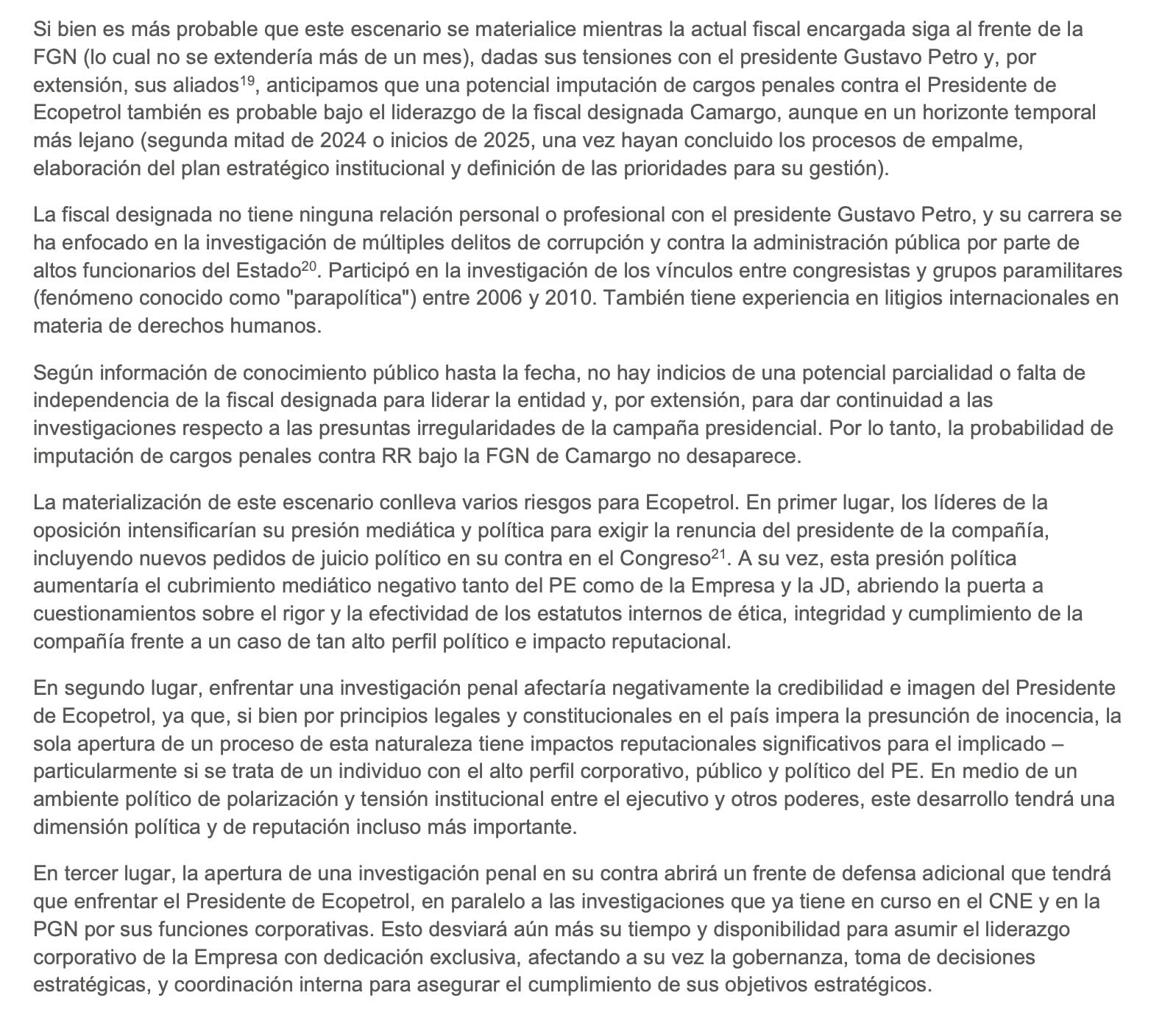 En el tercer escenario, el documento contempla que se abran investigaciones formales contra Roa mientras ejerce como presidente de Ecopetrol, lo que elevaría aún más los riesgos para la compañía. En particular, advierte sobre el impacto que esto podría tener en los mercados internacionales, dado que Ecopetrol cotiza en la Bolsa de Nueva York.