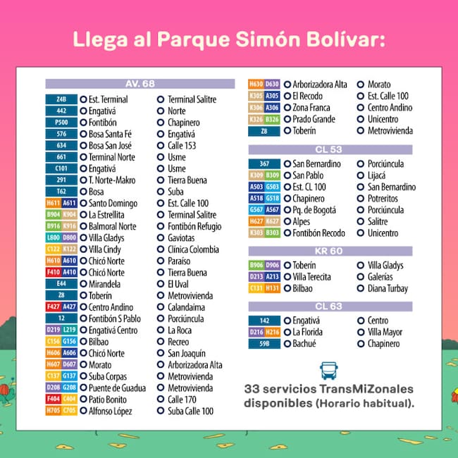 Siendo así, la Alcaldía de Bogotá dispuso la rutas habituales de TransMilenio para llegar al Parque Simón Bolívar y tres servicios especiales de TransMiZonal para volver a casa.