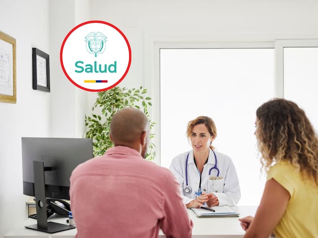 Imagen ilustrativa de personas siendo atendidas por un médico (Crédito: Getty Images). Arriba a la izquierda, logo del Ministerio de Salud (Crédito: MinSalud)