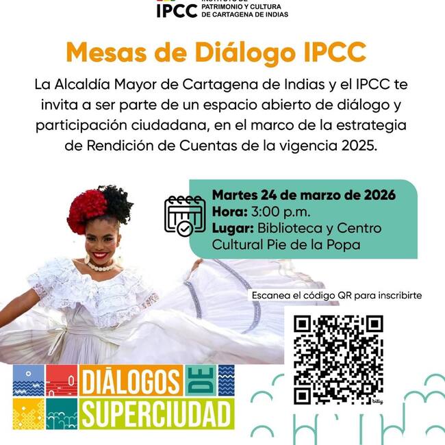 La cita para el sector cultural y patrimonial tendrá lugar el próximo martes 24 de marzo a las 3:00 p. m. en la Biblioteca y Centro Cultural Pie de la Popa. Para asistir, los interesados deben inscribirse aquí: https://bit.ly/MesasdedialogoIpcc