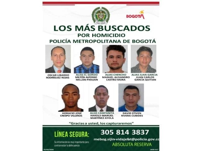 Presentan cartel de los más buscados por homicidio en Bogotá: eston son