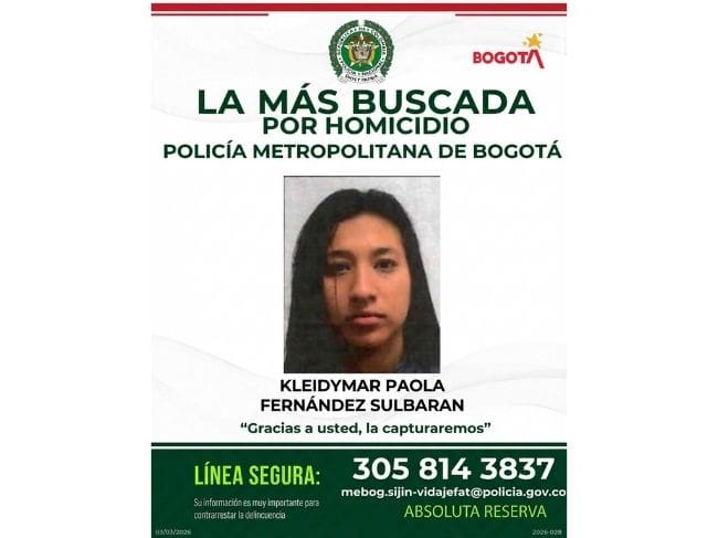 Mujer más buscada en Bogotá por homicidio. Foto: MEBOG