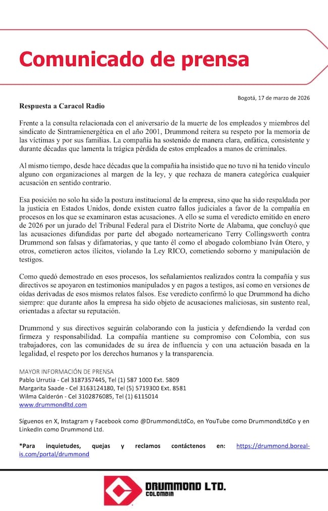 Este es el comunicado de la compañía Drummond frente a las declaraciones reservadas que revela Caracol Radio