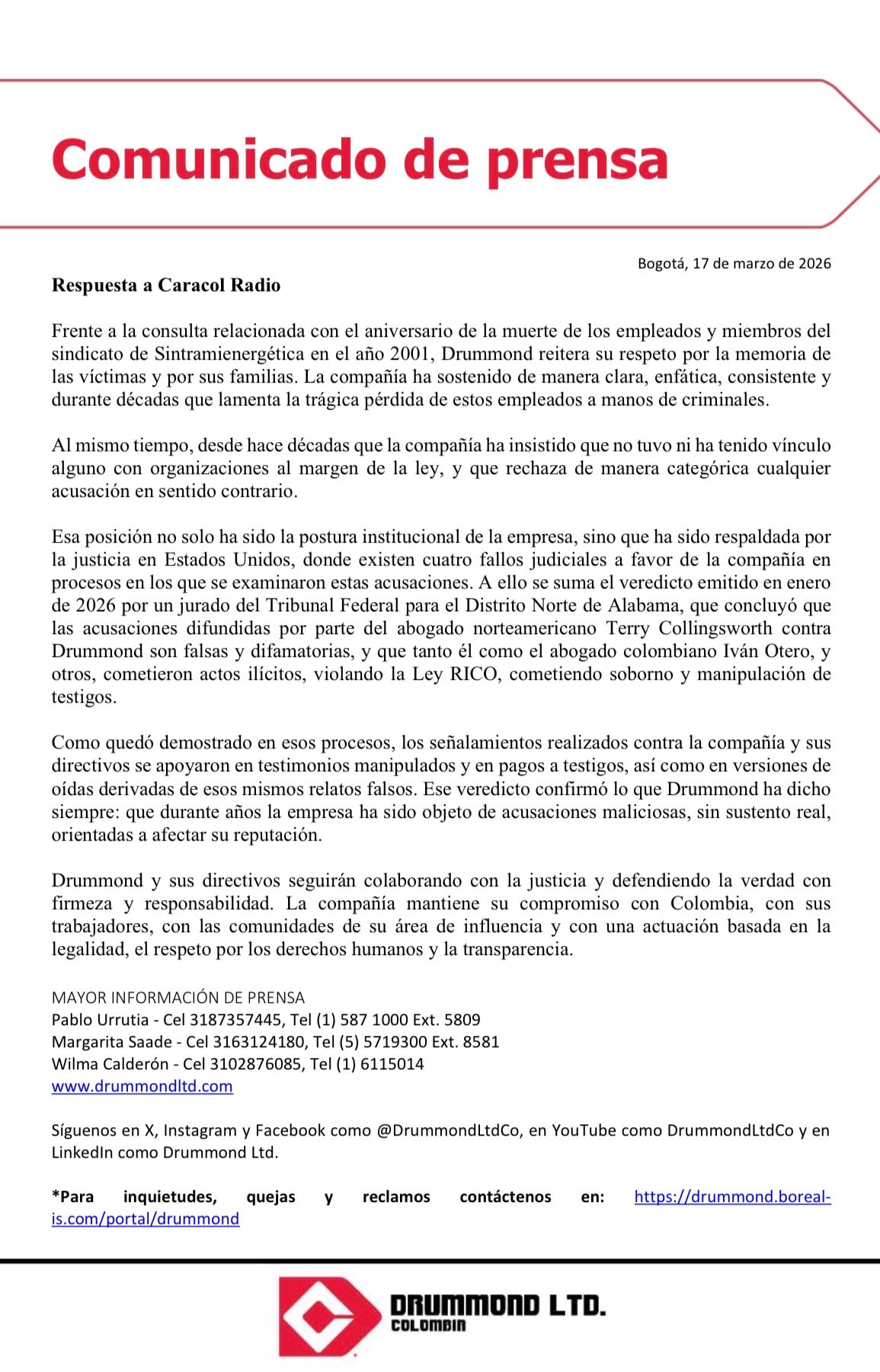 Caracol Radio contactó a la minera Drummond para conocer su respuesta a las nuevas declaraciones recaudadas por la Fiscalía contra varios de sus exejecutivos. La empresa tachó como falsas las acusaciones, señaló que provienen de testigos pagos (Jairo Charris) por el abogado de víctimas Terrence Collingsworth, que ya fueron desacreditados en tribunales de Estados Unidos, y reafirmó que no favoreció de ninguna manera a los grupos paramilitares.