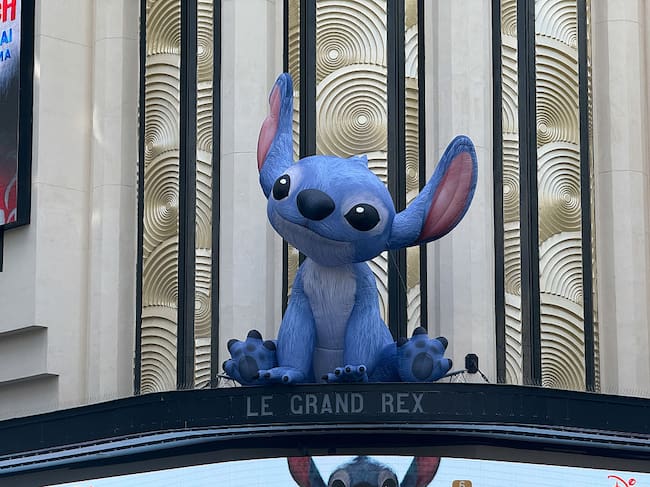 PARIS, FRANCE - MAY 20: A giant statue / puppet of Stitch is seen outside the building of the Grand Rex cinema, during the "Lilo & Stitch" Paris Gala Screening at Le Grand Rex on May 20, 2025 in Paris, France. (Photo by Edward Berthelot/Getty Images) / Edward Berthelot