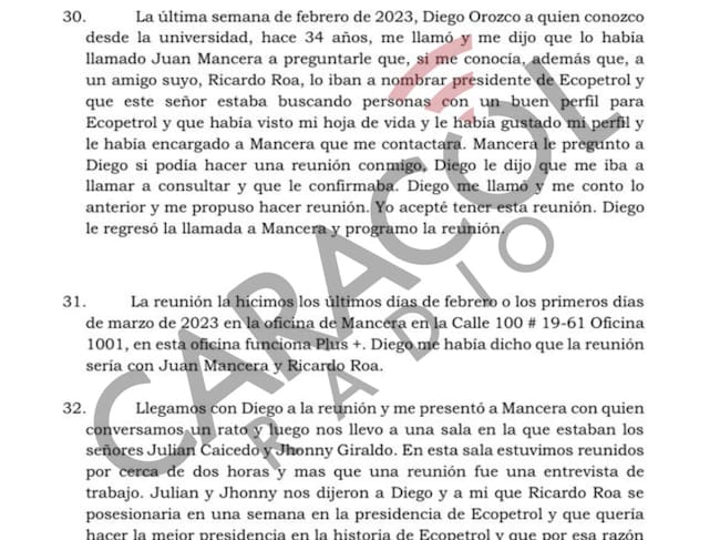 Luis Enrique Rojas, expresidente de Hocol, una filial de Ecopetrol, confirmó la veracidad de estos hechos a 6AM W de Caracol Radio. Según su testimonio, la reunión tuvo lugar en la oficina de Mancera, ubicada en la Calle 100 con 19, durante la última semana de febrero (o la primera de marzo) de 2023.