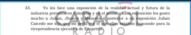 Tras la exposición, Caicedo le expresó a Rojas que su perfil era el que estaban buscando para la vicepresidencia ejecutiva de Ecopetrol. Según la denuncia, Roa no estuvo presente en la reunión. No obstante, sí participó su pareja. En ese momento, Roa tampoco había asumido la presidencia de la petrolera.