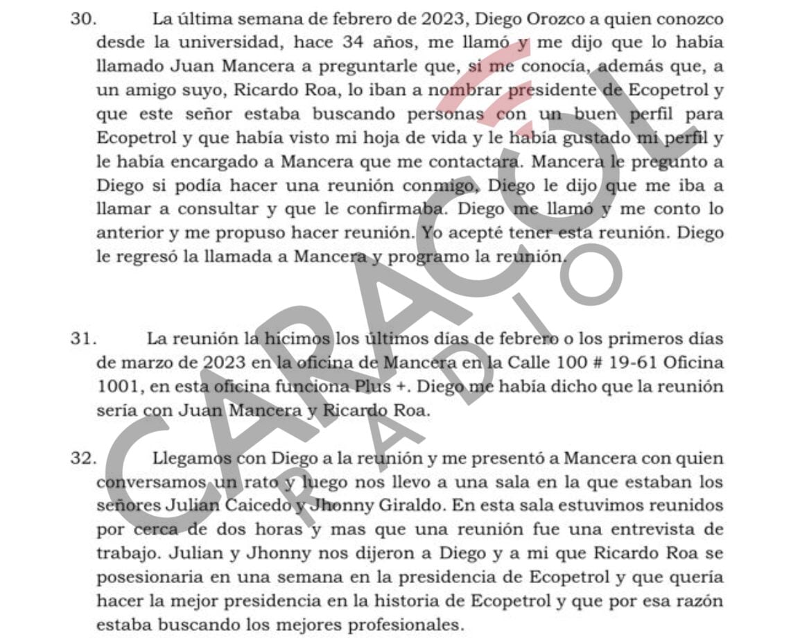 Luis Enrique Rojas, expresidente de Hocol, una filial de Ecopetrol, confirmó la veracidad de estos hechos a 6AM W de Caracol Radio. Según su testimonio, la reunión tuvo lugar en la oficina de Mancera, ubicada en la Calle 100 con 19, durante la última semana de febrero (o la primera de marzo) de 2023.