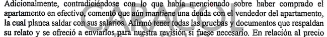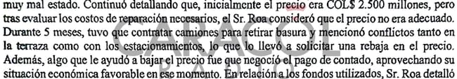 Los abogados interrogadores dejaron expresa constancia de que Roa, quien había dicho inicialmente que había pagado el apartamento de contado, después cambió la versión durante la entrevista: