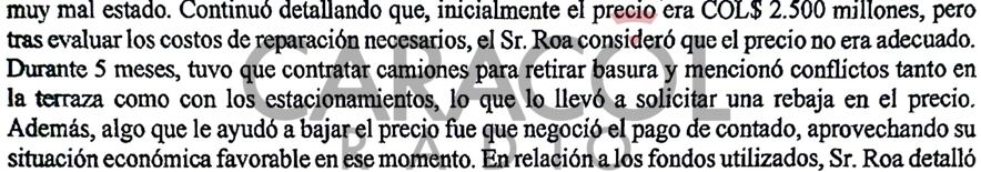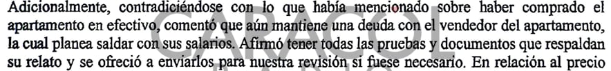 Los abogados interrogadores dejaron expresa constancia de que Roa, quien había dicho inicialmente que había pagado el apartamento de contado, después cambió la versión durante la entrevista: