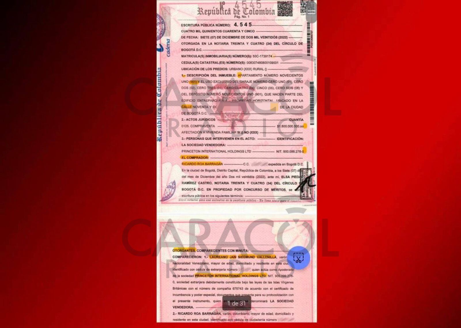 La explicación sobre el negocio del lujoso apartamento 901 está llena de contradicciones. Ricardo Roa aseguró inicialmente que lo había comprado de contado y que el precio pactado fue de 2.500 millones, pero que él consiguió una rebaja por la cantidad de obras necesarias para remodelarlo por el mal estado en que estaba y porque tenía los recursos para pagarlo de contado: