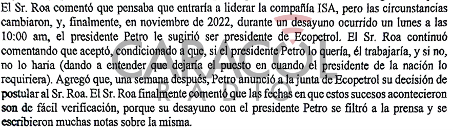 Empezando la entrevista, quedó claro que Ricardo Roa se convirtió en presidente de Ecopetrol por una decisión del presidente Gustavo Petro y no, como lo dijo la junta directiva de la época, por un proceso de selección hecho por la compañía de head hunter Heidrich & Struggles.