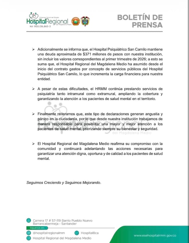 En el comunicado se habla de que el Hospital Regional del Magdalena Medio ha identificado casos de pacientes con intentos de suicidio que deben esperar hasta 5 días para recibir una respuesta por parte de San Camilo. “Esto representa un riesgo significativo en la atención oportuna de estos casos prioritarios”, aseguran.