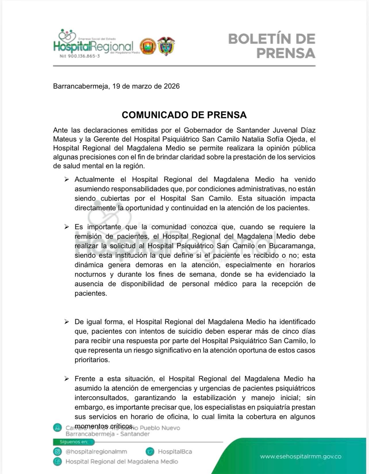En el comunicado se habla de que el Hospital Regional del Magdalena Medio ha identificado casos de pacientes con intentos de suicidio que deben esperar hasta 5 días para recibir una respuesta por parte de San Camilo. “Esto representa un riesgo significativo en la atención oportuna de estos casos prioritarios”, aseguran.