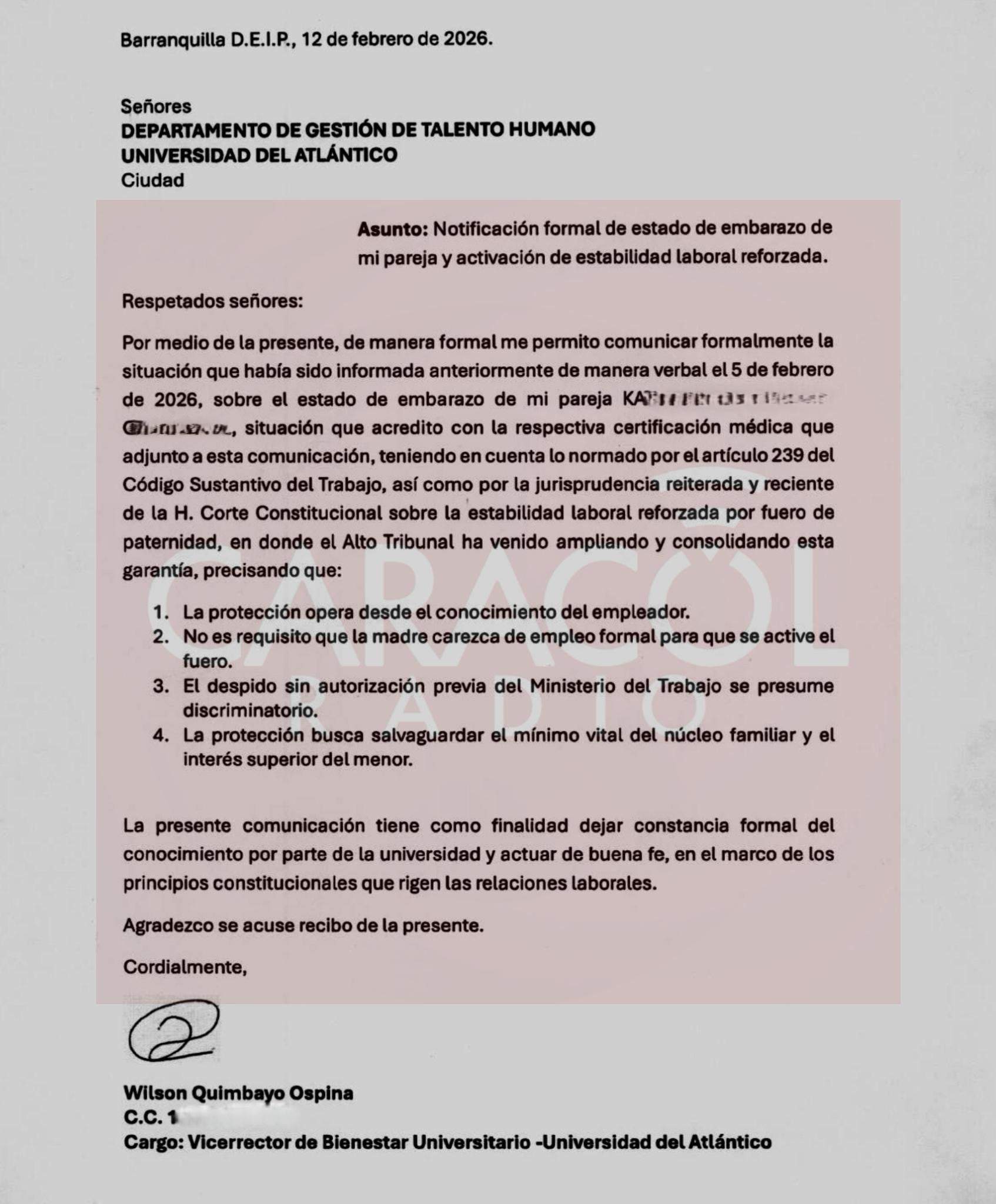 Sin embargo, de acuerdo con los documentos conocidos por Caracol Radio, la prueba de gravidez solo fue practicada el 12 de febrero de 2026. Ese mismo día Quimbayo presentó ante la universidad la notificaicón de fuero de paternidad, es decir, un día después de la notificación del fallo de segunda instancia que ordenaba el reintegro de González.
