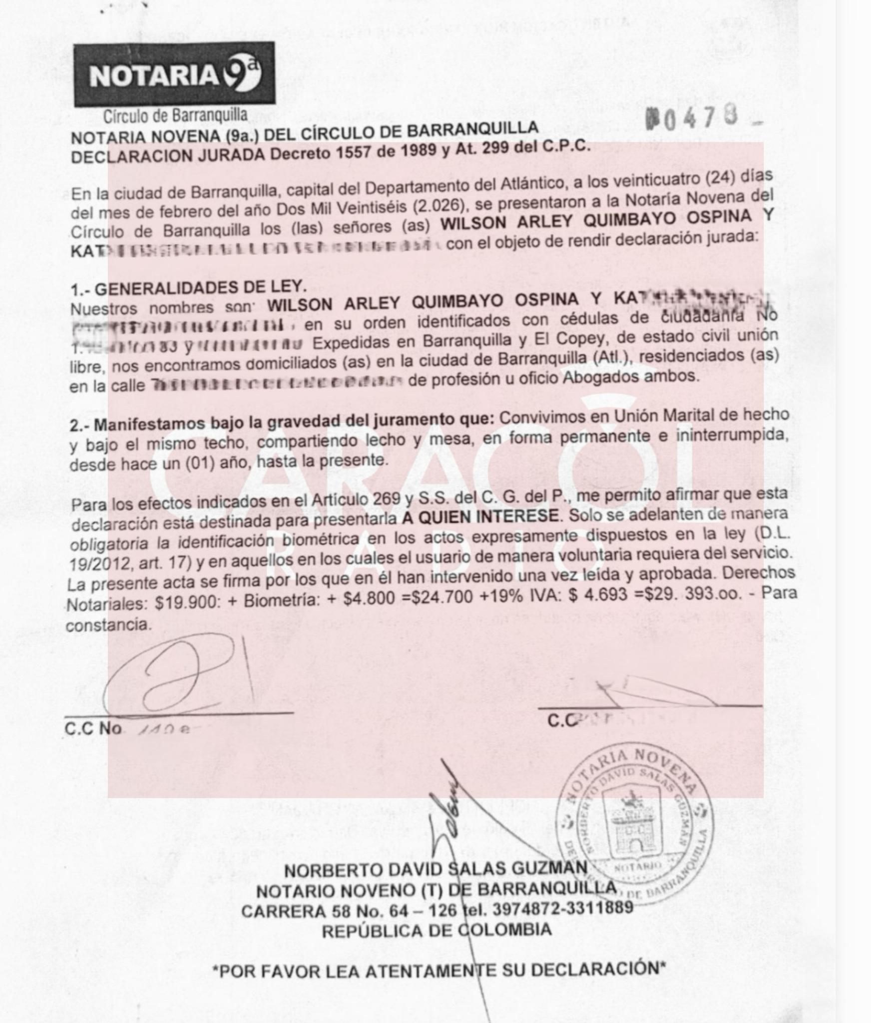 Declaración juramentada de Wilson Quimbayo