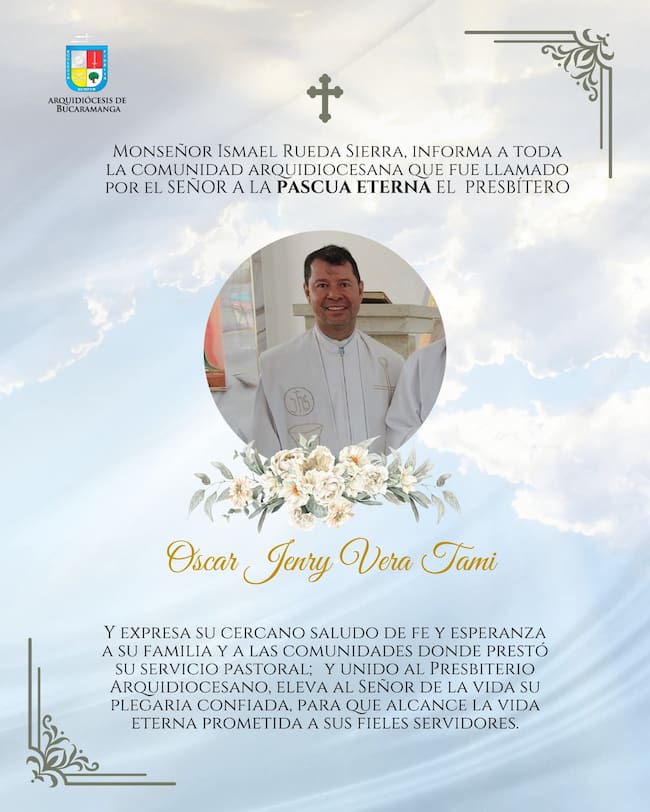 “Monseñor Ismael Rueda Sierra informa a toda la comunidad arquidiocesana que fue llamado por el Señor a la Pascua eterna el presbítero Óscar Jenry Vera Tami”.