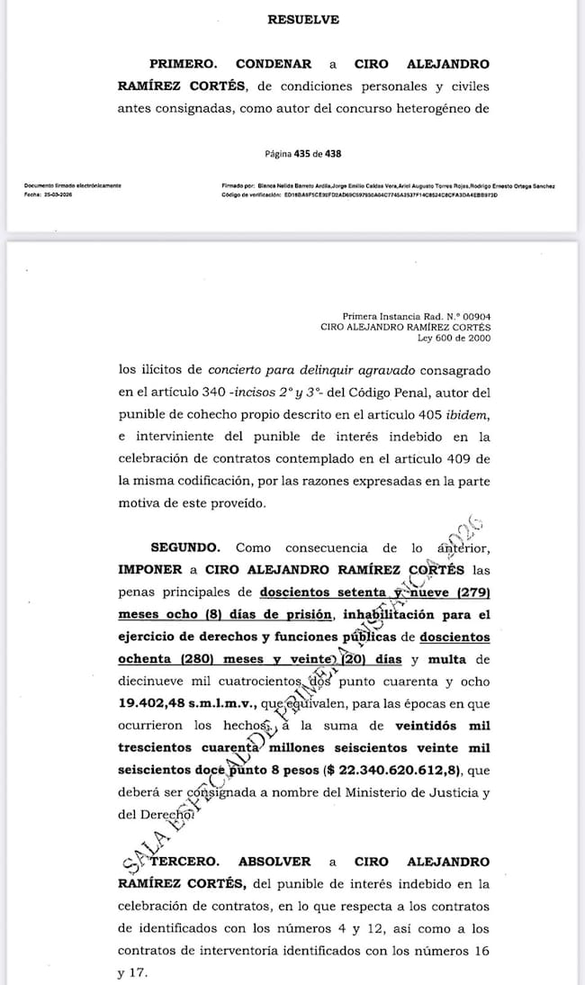 En la parte resolutiva del fallo, la Corte fue explícita: “condenar a Ciro Alejandro Ramírez Cortés (…) como autor del concurso heterogéneo de los ilícitos de concierto para delinquir agravado (…) autor del punible de cohecho propio (…) e interviniente del punible de interés indebido en la celebración de contratos”, por las razones expuestas en la sentencia.