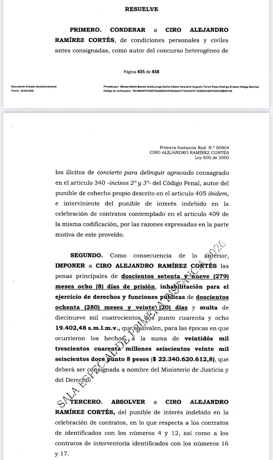 En la parte resolutiva del fallo, la Corte fue explícita: “condenar a Ciro Alejandro Ramírez Cortés (…) como autor del concurso heterogéneo de los ilícitos de concierto para delinquir agravado (…) autor del punible de cohecho propio (…) e interviniente del punible de interés indebido en la celebración de contratos”, por las razones expuestas en la sentencia.