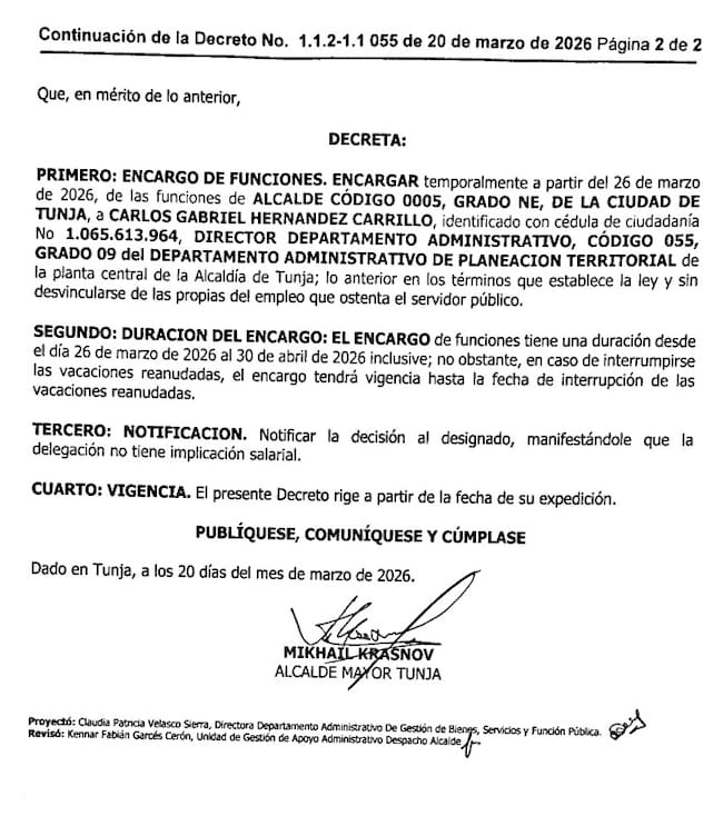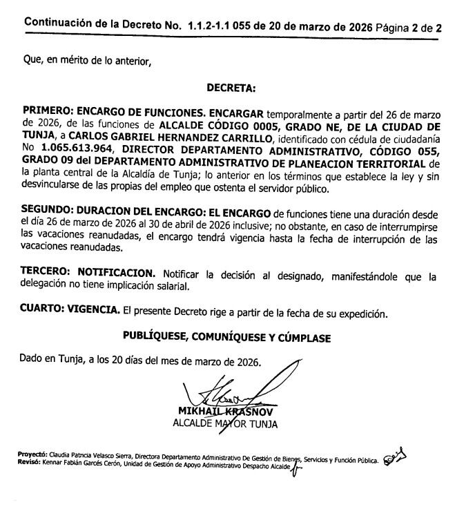Mediante el Decreto No. 055 de 2026, se encarga como alcalde de Tunja al secretario de Planeación, Carlos Gabriel Hernández Carrillo desde el 26 de marzo y hasta el 30 de abril.