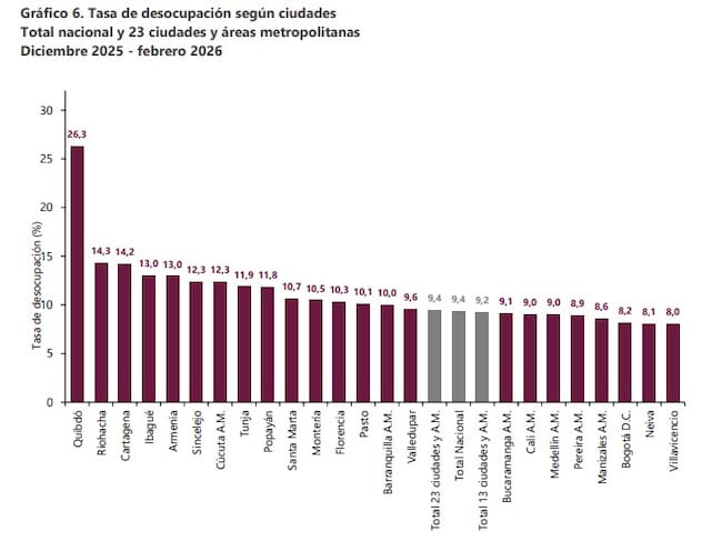 Entre las 23 ciudades y áreas metropolitanas analizadas, Quibdó registró la tasa de desempleo más alta, con un 26,3%. Le siguen Riohacha con 14,3% y Cartagena con 14,2%.