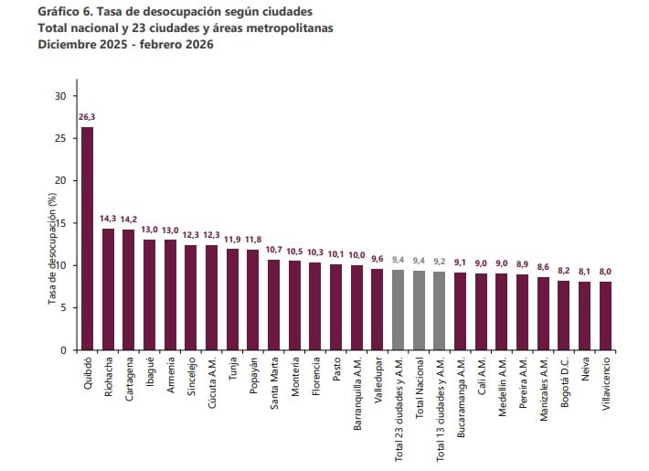 Entre las 23 ciudades y áreas metropolitanas analizadas, Quibdó registró la tasa de desempleo más alta, con un 26,3%. Le siguen Riohacha con 14,3% y Cartagena con 14,2%.