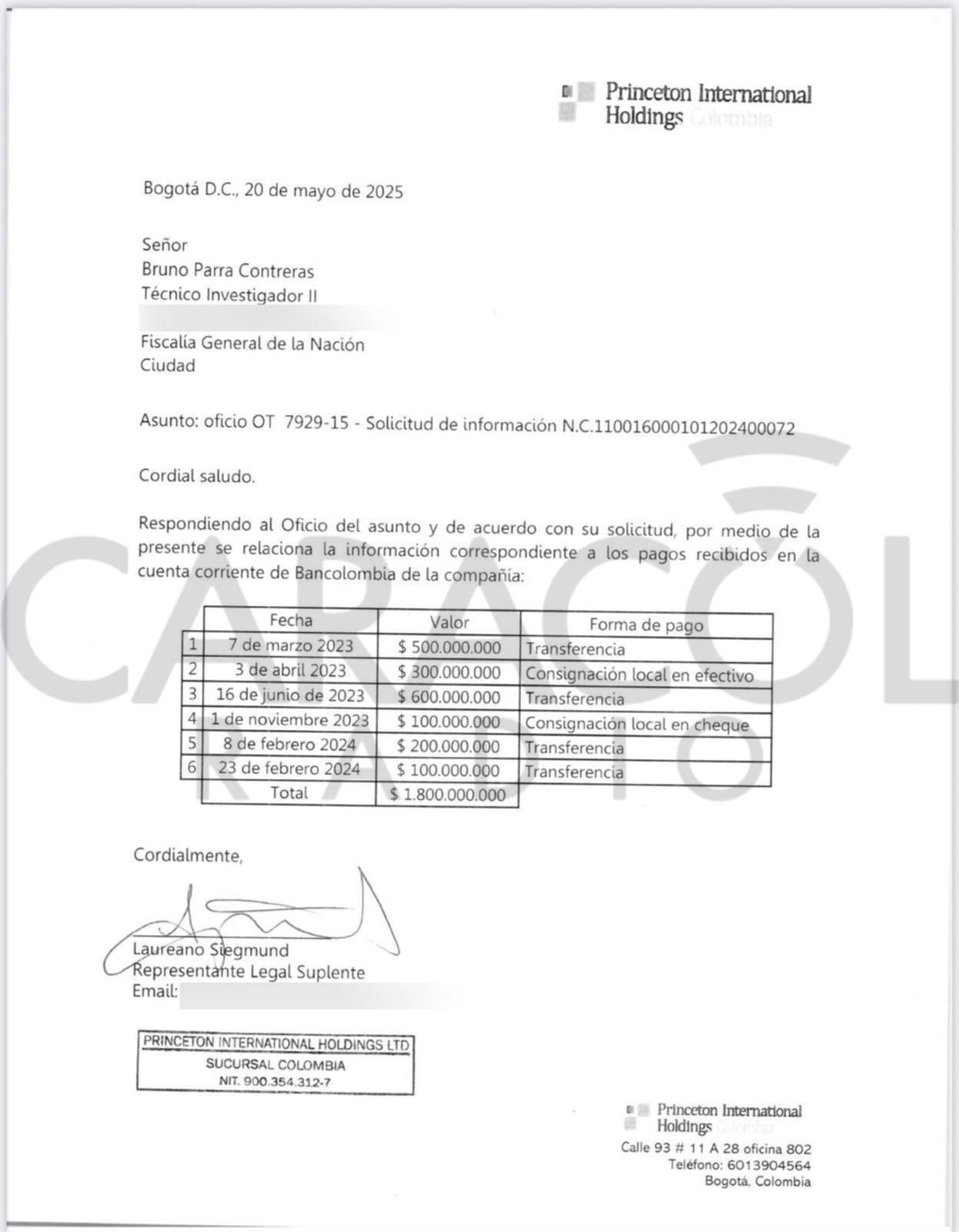 • Dice el señor Roa que al día siguiente de cerrar el acuerdo hizo una transferencia por 450 millones de pesos con un cheque personal de Bancolombia y que en enero de 2023 ya había pagado 1.500 millones de pesos. Buscando el rastro de estos pagos, seis investigadores de la Fiscalía registraron, papel por papel, las oficinas de Serafino Iacono y NO encontraron pagos provenientes de Roa. Los únicos pagos son los que hemos mostrado aquí en El Reporte, en donde el coronel Mancera efectuó seis movimientos que incluyen un depósito de 300 millones en efectivo. Los pagos arrancaron en marzo de 2023 y terminaron en febrero de 2024, Es decir cinco de los seis fueron efectuados cuando ya Roa era presidente de Ecopetrol.