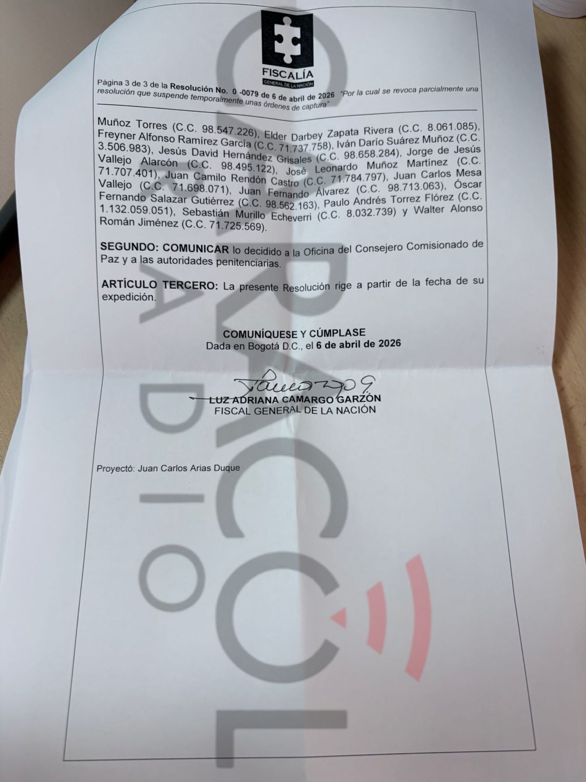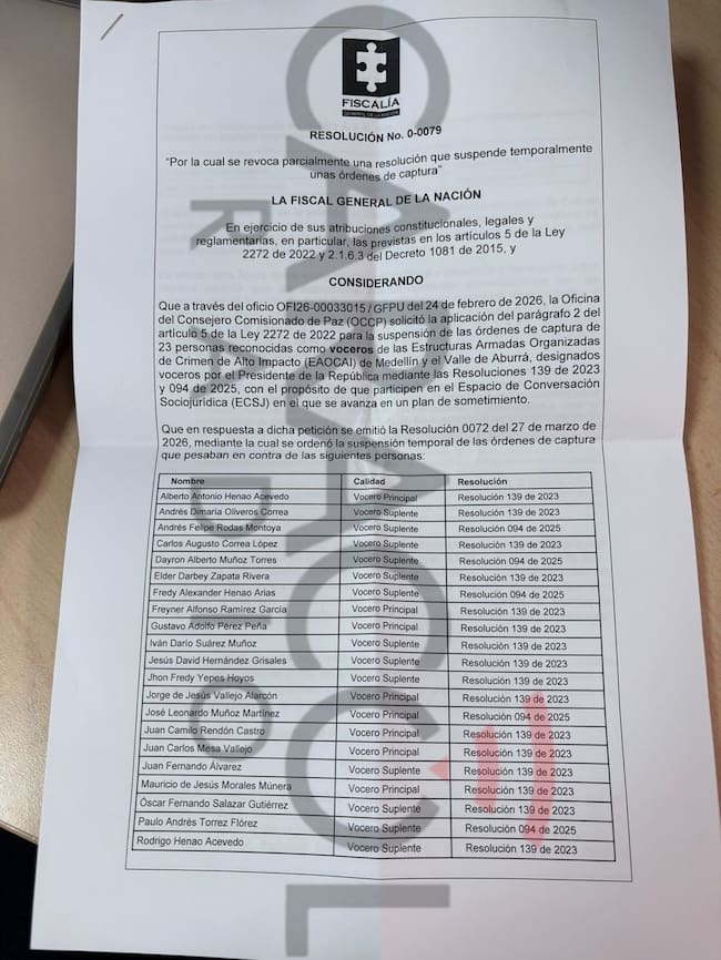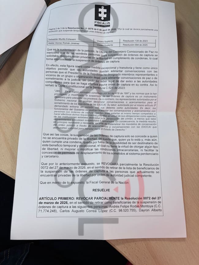 “De parte de la Fiscalía se emitió esta resolución, la 0079, que ayer se comunicó a la Oficina del Consejero Comisionado y al INPEC, revocando la suspensión de 16 de esas 23 órdenes de captura respecto de las personas que tenían esa suspensión”, expresó.