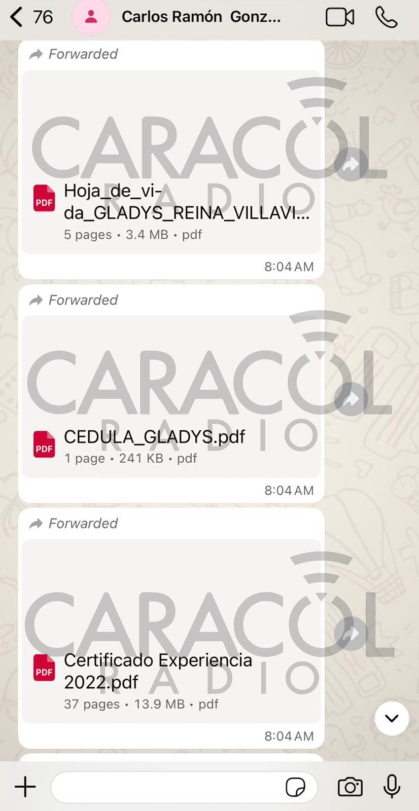 El 8 de abril de 2024, Carlos Ramón González, quien en ese momento manejaba la Dirección Nacional de Inteligencia, DNI, le envió un mensaje de WhatsApp al director de la DIAN, Luis Carlos Reyes, el cual se puede ver a continuación:
