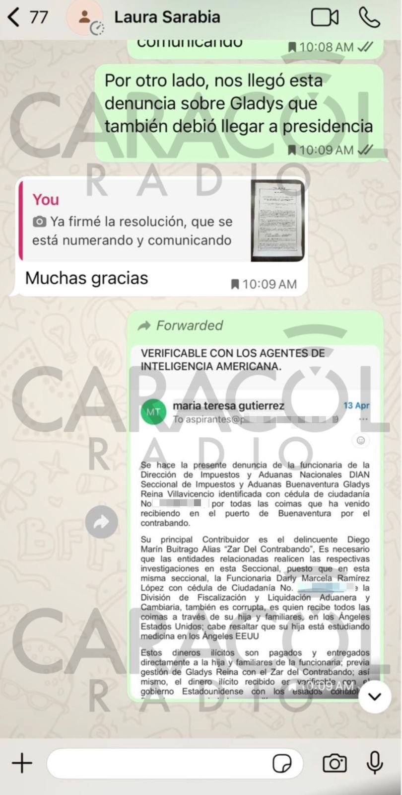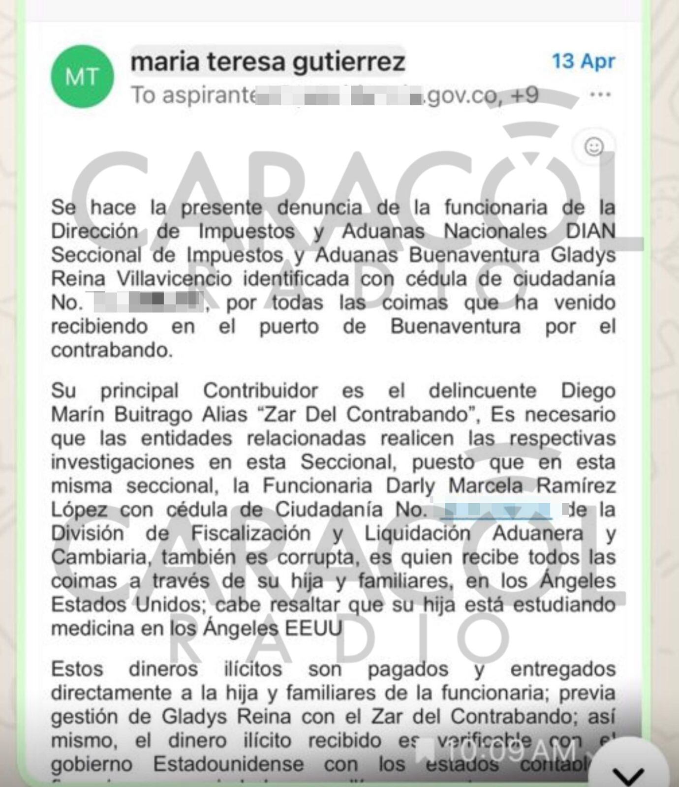 - “Se hace la presente denuncia de la funcionaria de la Dirección de Impuestos y Aduanas Nacionales, DIAN, seccional Buenaventura, Gladys Reina Villavicencio, por todas las coimas que ha venido recibiendo en el Puerto de Buenaventura por el contrabando”.