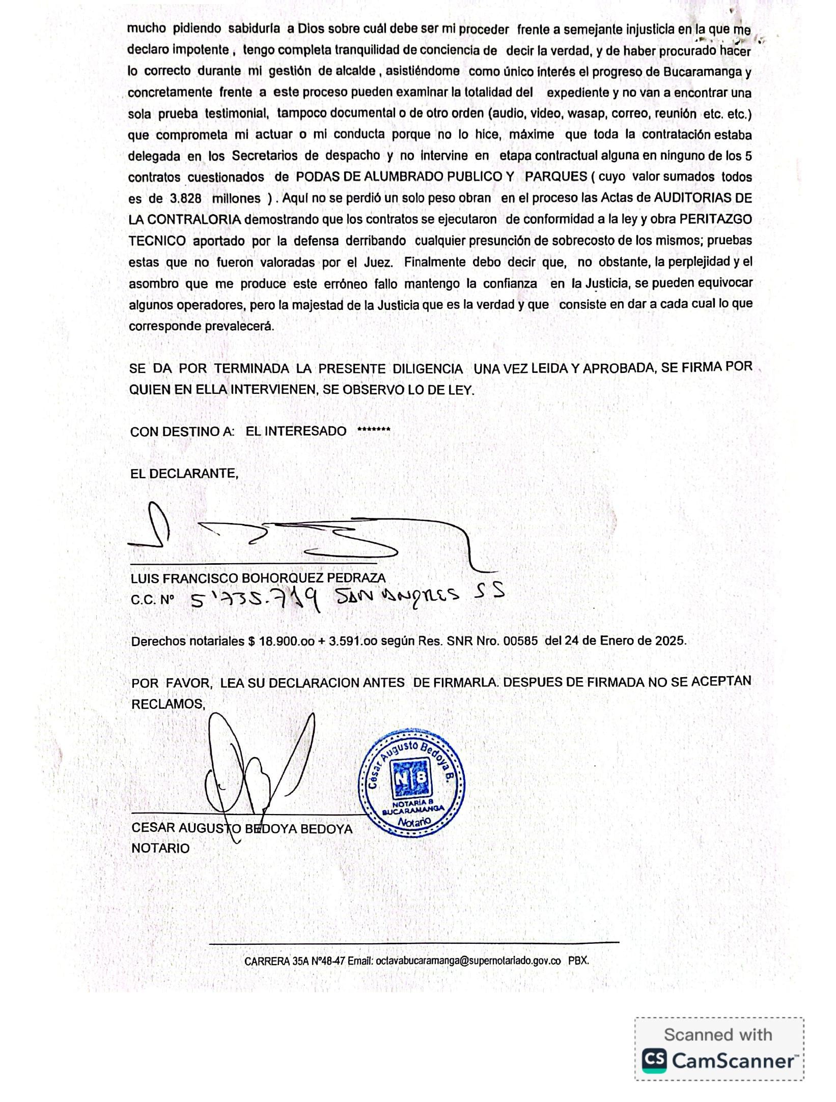 La oferta habría ocurrido en desarrollo del juicio, pero el abogado Ramírez solo reveló la oferta a su defendido, el exalcalde de Bucaramanga, el 20 de septiembre de 2024, días después de que se conociera el sentido del fallo que terminó siendo adverso a Bohórquez Pedraza.