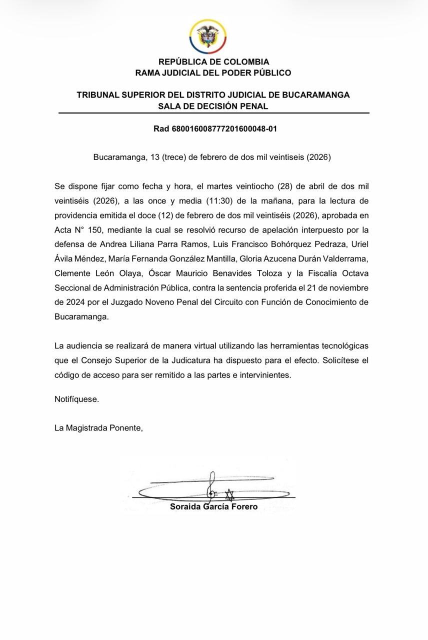 En esa diligencia se decidirá sobre la apelación a la sentencia proferida el 21 de noviembre de 2024 por el juzgado penal del circuito con función de conocimiento de Bucaramanga en contra de 7 personas, entre ellas el exalcalde de Bucaramanga, Luis Francisco Bohórquez Pedraza, su secretario de Infraestructura, Clemente León Olaya y la directora de la Oficina de Alumbrado Público, Gloria Azucena Durán y otras tres personas.