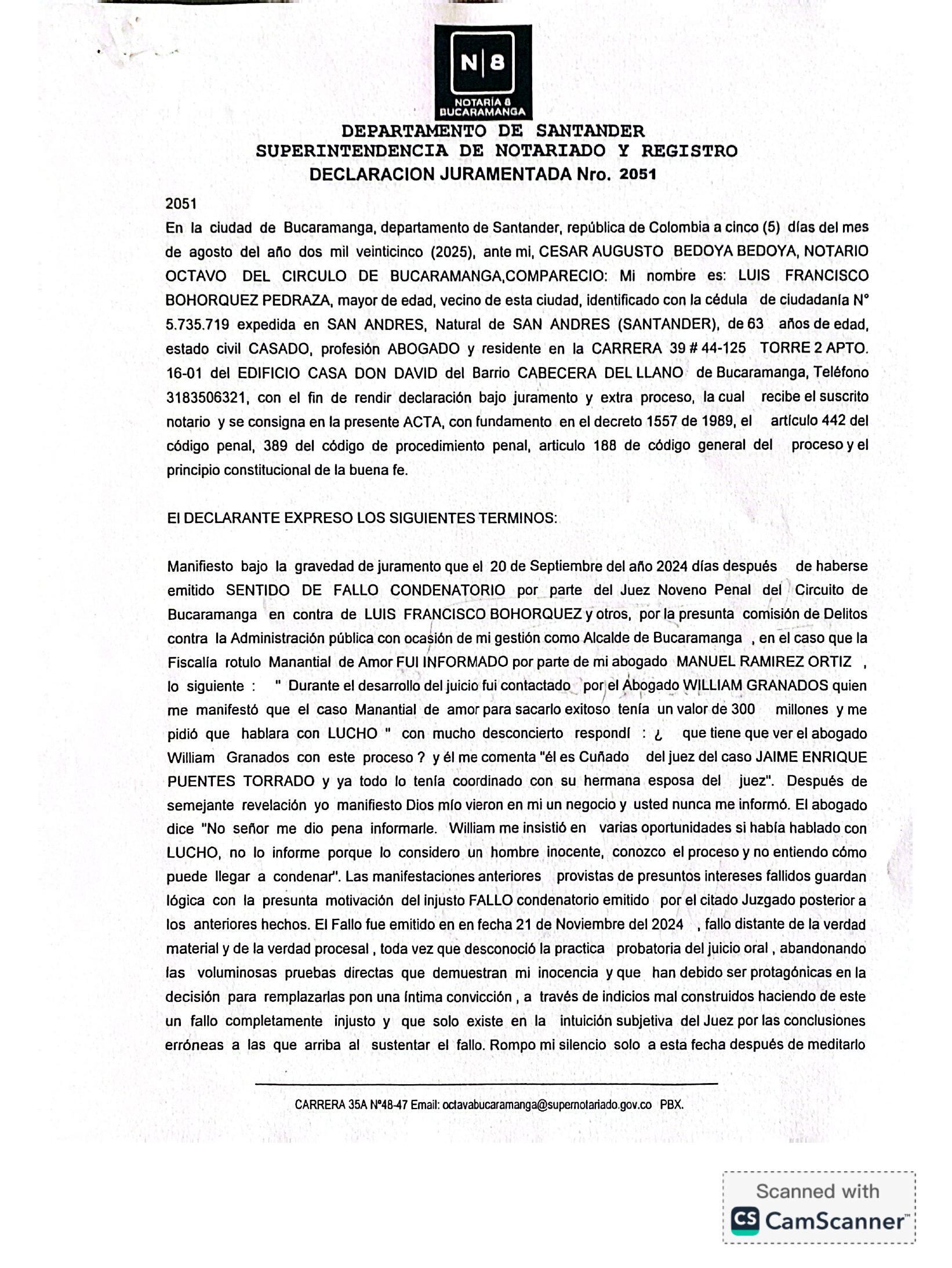 En una declaración juramentada ante notario, el exalcalde aseguró que su abogado Manuel Ramírez fue contactado por William Granados Ferreira cuñado del juez de la causa, Jaime Enrique Puentes Torrado.