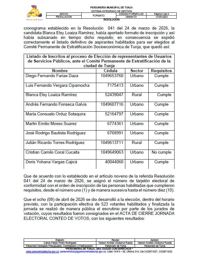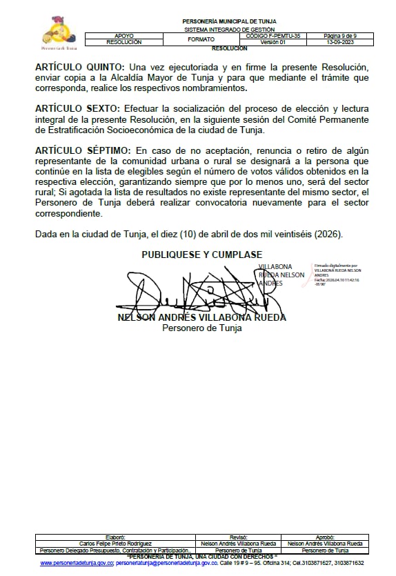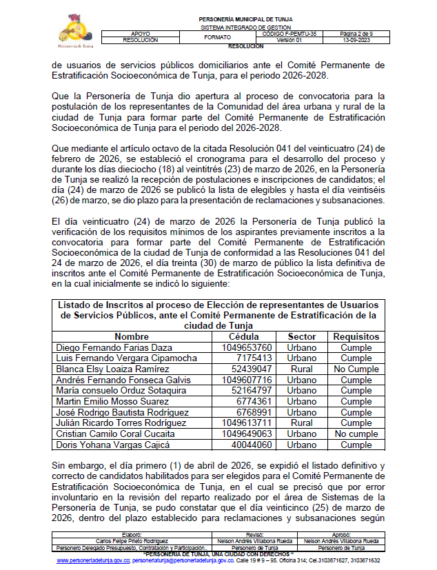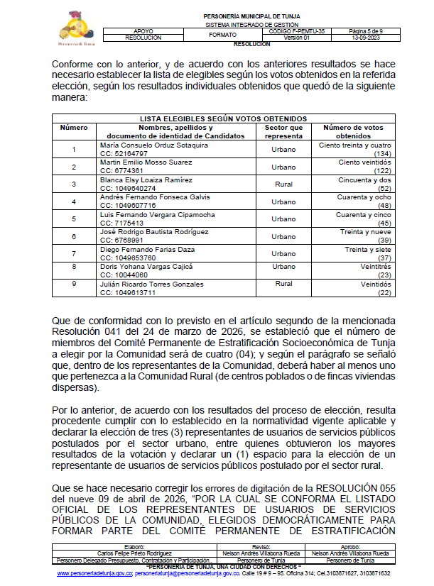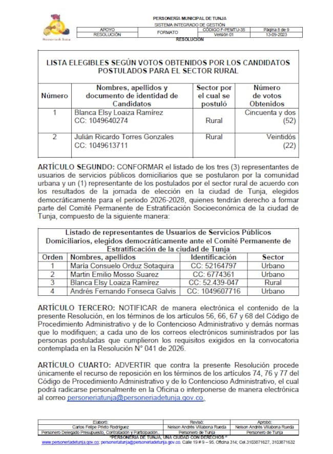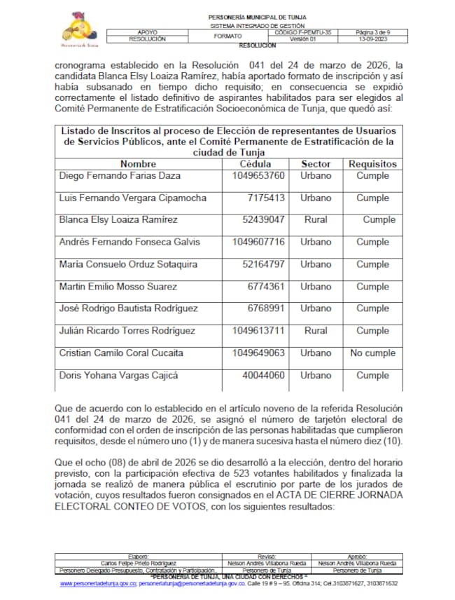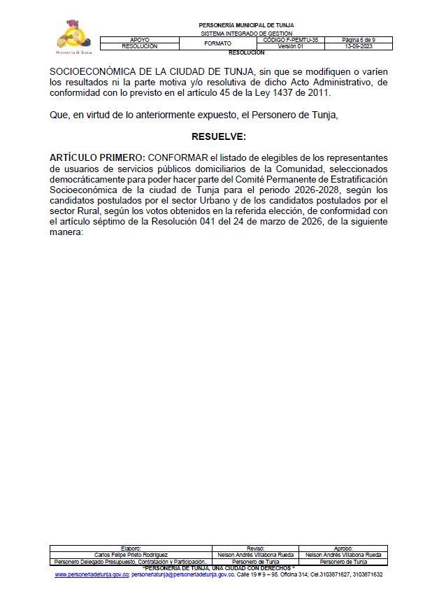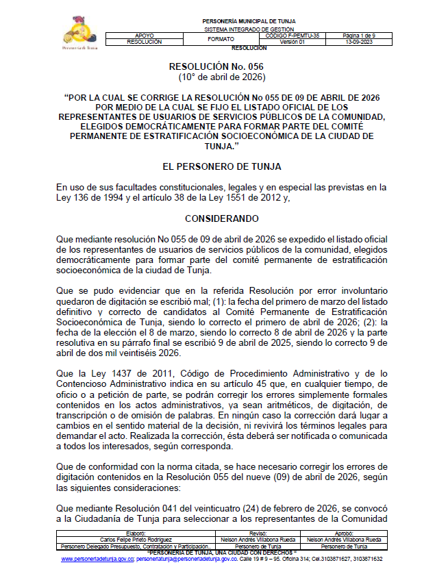 La Personería de Tunja expidió la Resolución 056 del 10 de abril de 2026, mediante la cual corrigió errores formales contenidos en la Resolución 055, que había fijado el listado oficial de los representantes de usuarios de servicios públicos elegidos para integrar el Comité Permanente de Estratificación Socioeconómica de la ciudad.