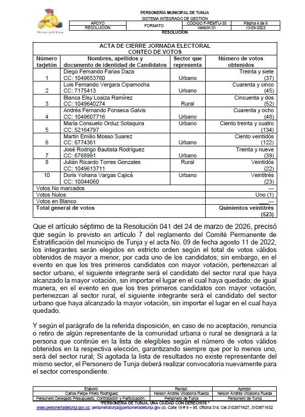 El proceso de elección se desarrolló tras una convocatoria abierta realizada en febrero de 2026, con inscripción de candidatos en marzo y votación el 8 de abril, en la que participaron 523 ciudadanos. Los resultados definieron una lista de elegibles encabezada por los candidatos con mayor votación, garantizando la representación tanto del sector urbano como rural.