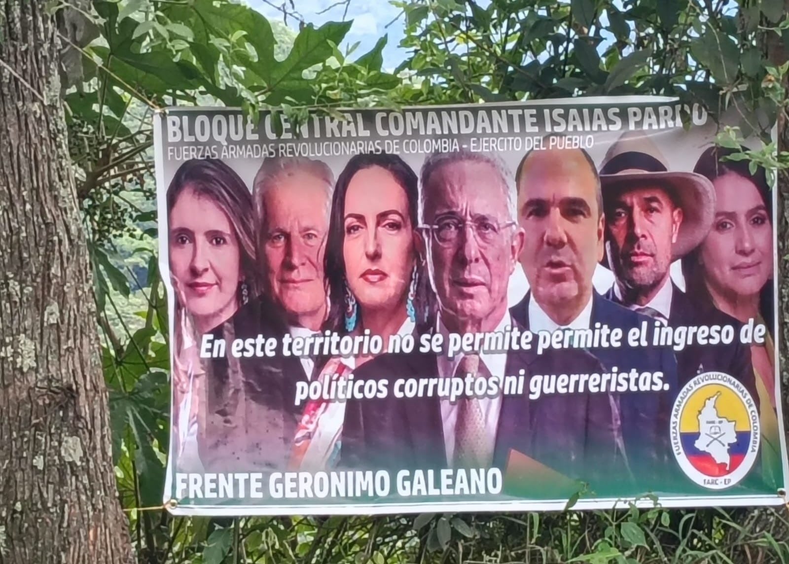 Durante el más reciente fin de semana apareció una pancarta alusiva al frente Gerónimo Galeano de las disidencias de las Farc, en la cual se prohíbe el ingreso de dirigentes del partido Centro Democrático al municipio de Planadas, ubicado en el extremo sur del Tolima, en límites con el Huila.