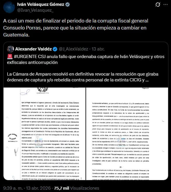“A casi un mes de finalizar el periodo de la corrupta fiscal general Consuelo Porras, parece que la situación empieza a cambiar en Guatemala”, argumentó Velásquez este lunes al conocer la decisión del Supremo.