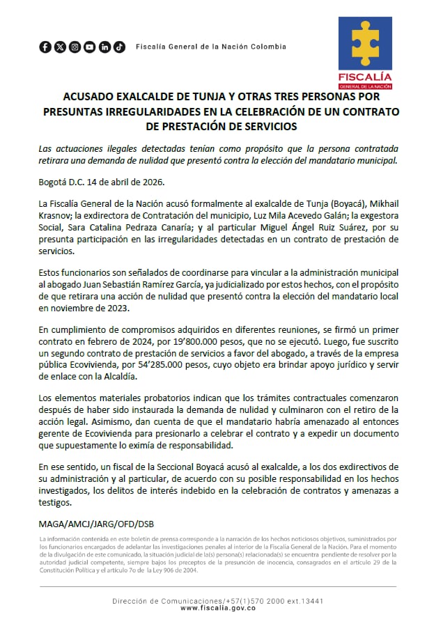 La Fiscalía General de la Nación acusó formalmente al alcalde de Tunja, Mikhail Krasnov, por su presunta participación en irregularidades relacionadas con la celebración de contratos de prestación de serviciosJunto a él fueron vinculados la directora de Contratación, Luz Mila Acevedo Galán; la exgestora social, Sara Catalina Pedraza Canaría; y el particular Miguel Ángel Ruiz Suárez.