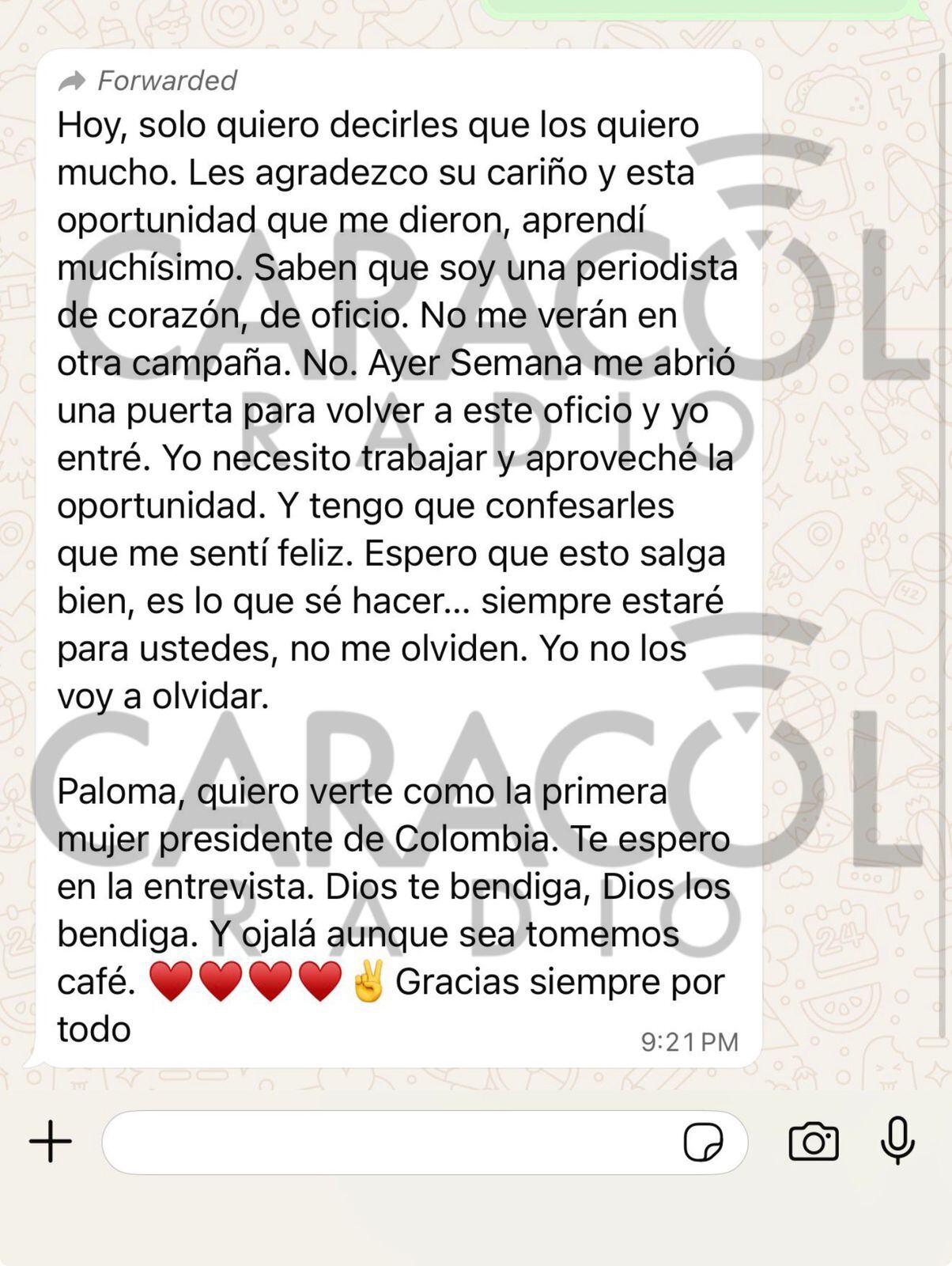 Paloma, quiero verte como la primera mujer presidente de Colombia. Te espero en la entrevista. Dios te bendiga, Dios los bendiga. Y ojalá aunque sea tomemos un café. (Cuatro corazones, una mano haciendo la V de Victoria) Gracias, siempre por todo”.