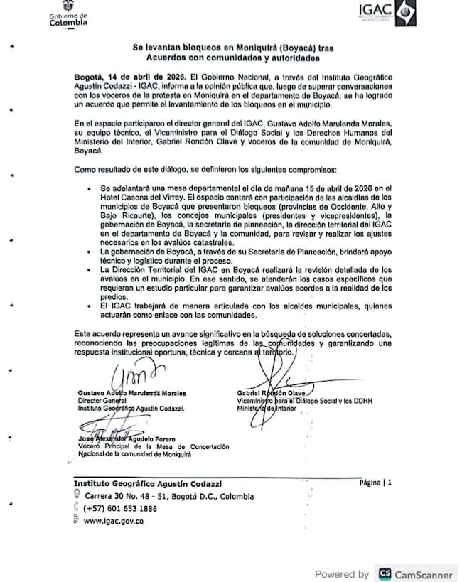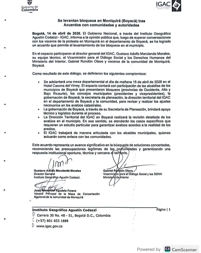 El Gobierno Nacional por intermedio del Instituto Geográfico Agustín Codazzi, IGAC, informa a la opinión pública que luego o superar conversaciones con los voceros de la protesta en Moniquirá, Boyacá, se logró un acuerdo que permite el levantamiento de los bloqueos en el municipio.