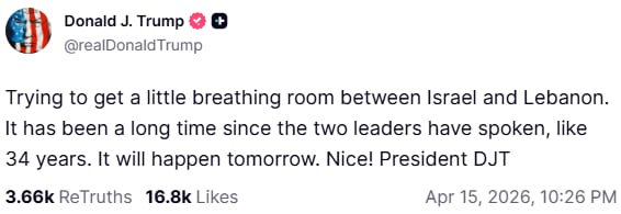 “Estamos intentando dar algo de espacio para respirar entre Israel y el Líbano. Ha pasado mucho tiempo desde que los dos líderes han hablado, como 34 años. Mañana sucederá. ¡Genial!”, escribió Trump el miércoles por la noche en su cuenta de Truth Social.